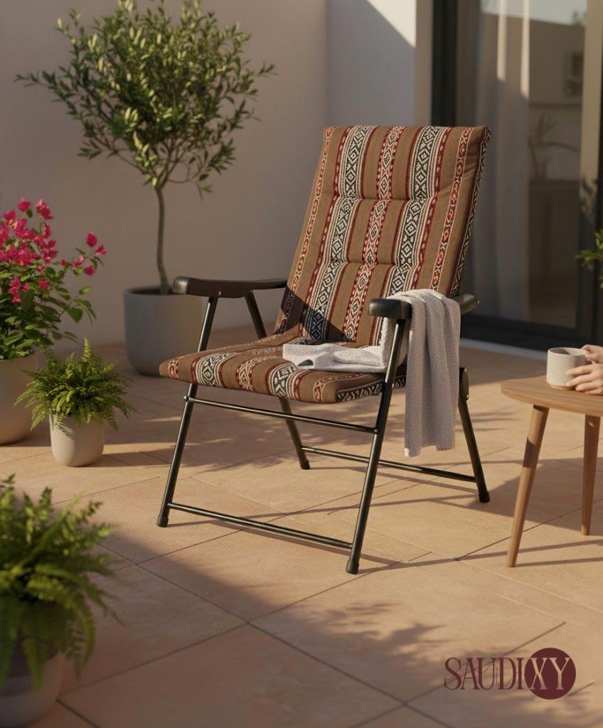 استمتع بلحظات الراحة في مساحتك الخارجية مع هذا الكرسي الأنيق الذي يجمع بين الطابع التراثي واللمسة العصرية. يتميز الكرسي بوسادة مبطنة بنقوش مستوحاة من التراث العربي، تضيف دفئًا وأناقة للمكان، مع توفير راحة مثالية للجلوس لفترات طويلة.
